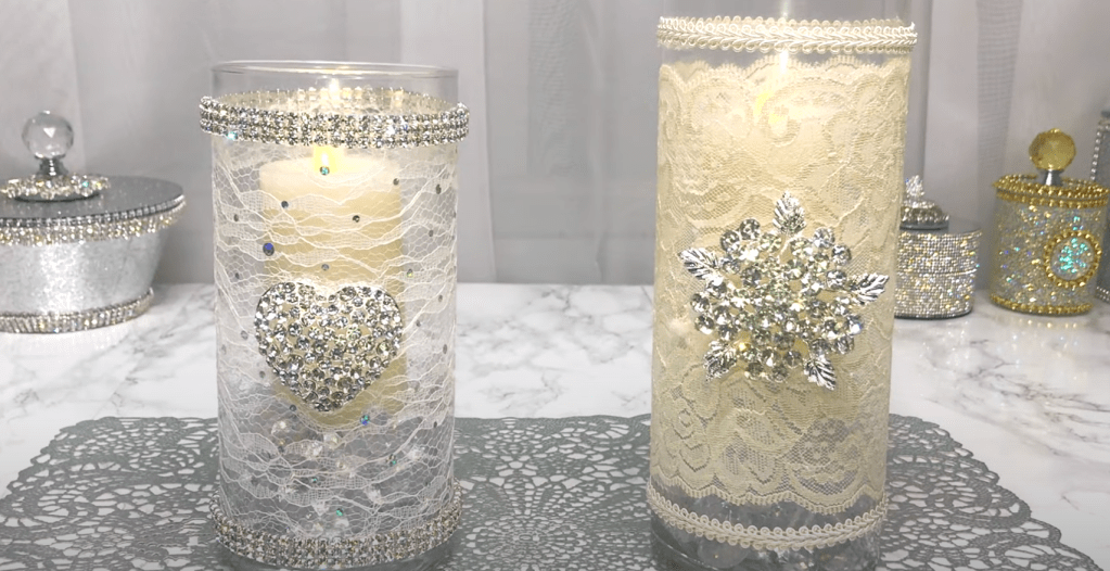 Check out my how to video to see how easy these were to make. The crystal brooches and glittered lace made these candles holders come together beautifull.