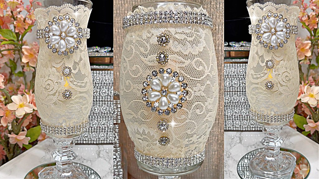 Both vases I got from the Dollar Tree. The Large Pearl and Rhinestone Brooches I got from the Thrift Store. The glass Candlestick holders are from my Thrift Store. Please check the description section of video for the rest of the info. Thanks for watching.